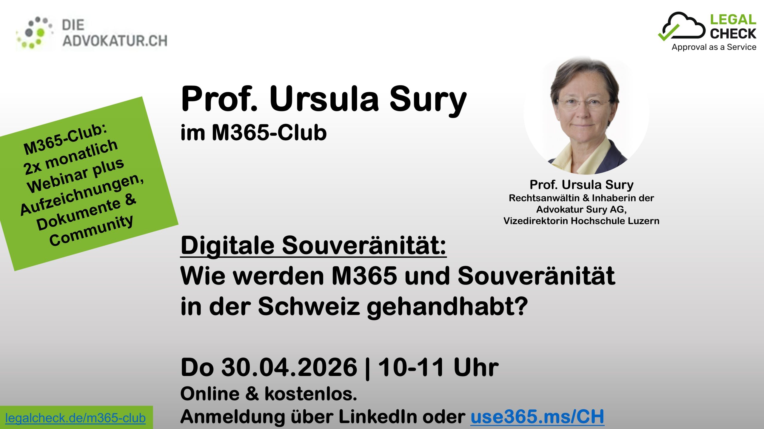 In der Sonderausgabe der Webinarreihe von LegalCheck„M365-Club“ wird Frau Prof. Ursula Sury zur Digitalen Souveränität referieren.
